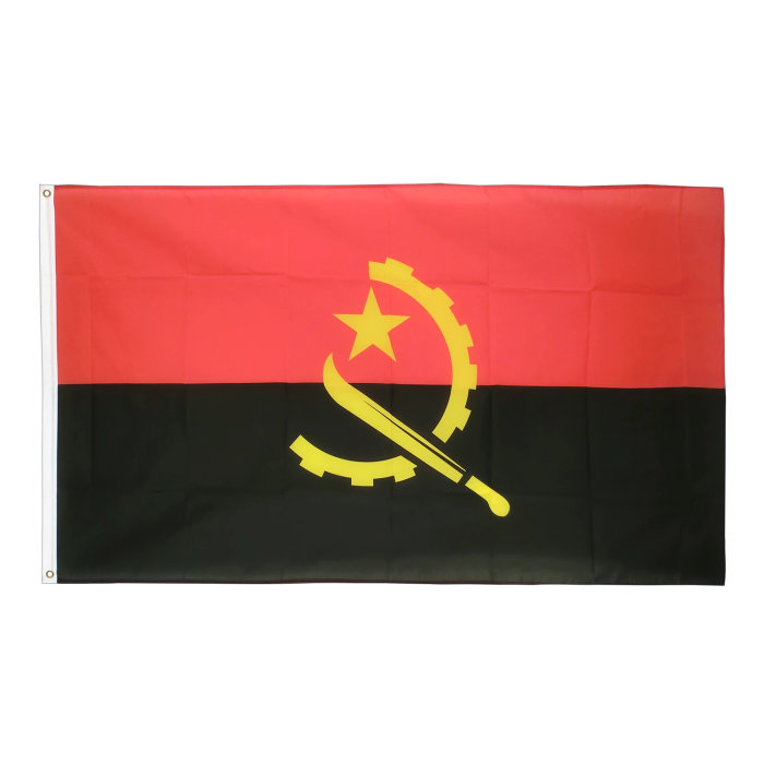 Флаг Анголы выполнен из полиэфирной ткани, обладающей отличными эксплуатационными характеристиками. Он устойчив к внешним факторам, легко окрашивается и сохраняет насыщенные цвета даже при длительном использовании. Легкость ткани способствует удобному поднятию флага и предотвращает его ускоренный износ, особенно в ветреных условиях. Флаг Анголы представлен в традиционной расцветке: две горизонтальные полосы — красная и черная, с желтым эмблематическим изображением зубчатого колеса и мачете в центре. Красный цвет символизирует борьбу за независимость, черный — африканский континент, а желтые элементы — индустриальное и сельскохозяйственное развитие страны. Флаг предназначен для идентификации судов при заходе в порт Лобиту (Port of Lobito), порт Луанда (Port of Luanda), порт Намибе (Port of Namibe) и порт Сойо (Port of Soyo), обеспечивая их соответствие международным стандартам и узнаваемость в морских перевозках.-