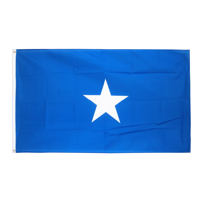 Флаг выполнен в насыщенном небесно-голубом цвете, символизирующем мир и стабильность. В центре располагается белая пятиконечная звезда, которая олицетворяет единство пяти регионов, исторически населённых сомалийцами. Яркость и стойкость красок обеспечиваются качественной печатью, устойчивой к выгоранию и вымыванию.