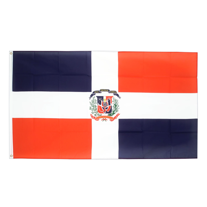 Для изготовления флага используется полиэфирная ткань с плотностью около 210 г/м². Этот материал отличается высокой прочностью и устойчивостью к атмосферным воздействиям — дождю, ветру и солнечным лучам. Он хорошо сохраняет форму, легко окрашивается и обеспечивает яркость и стойкость цветов. Лёгкость ткани облегчает подъем флага и снижает его износ даже при сильном ветре. Флаг Доминиканской Республики выполнен в традиционном дизайне: он разделён на четыре прямоугольных сегмента — синие и красные поля чередуются крестом белого цвета. В центре пересечения расположен герб страны, символизирующий национальную гордость и свободу. Цвета флага имеют символическое значение: синий — свобода, красный — кровь героев, белый — спасение. Все элементы нанесены чётко, с высокой точностью цветопередачи и устойчивостью к выцветанию. Флаг предназначен для использования при заходе судов в международный порт Доминиканской Республики: Порт Кауседо (Port of Caucedo) Он соответствует требованиям для морского флагового оформления и может применяться в международной судоходной практике.