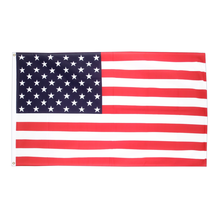Флаг США выполнен в соответствии с официальными стандартами: чередующиеся 13 полос красного и белого цветов символизируют первоначальные штаты, а синее поле с 50 белыми пятиконечными звездами отражает текущее количество штатов. Все цвета насыщенные и стойкие, соответствующие государственным нормам. Синий цвет глубокий и насыщенный, красный — яркий, а белый — чистый и контрастный.