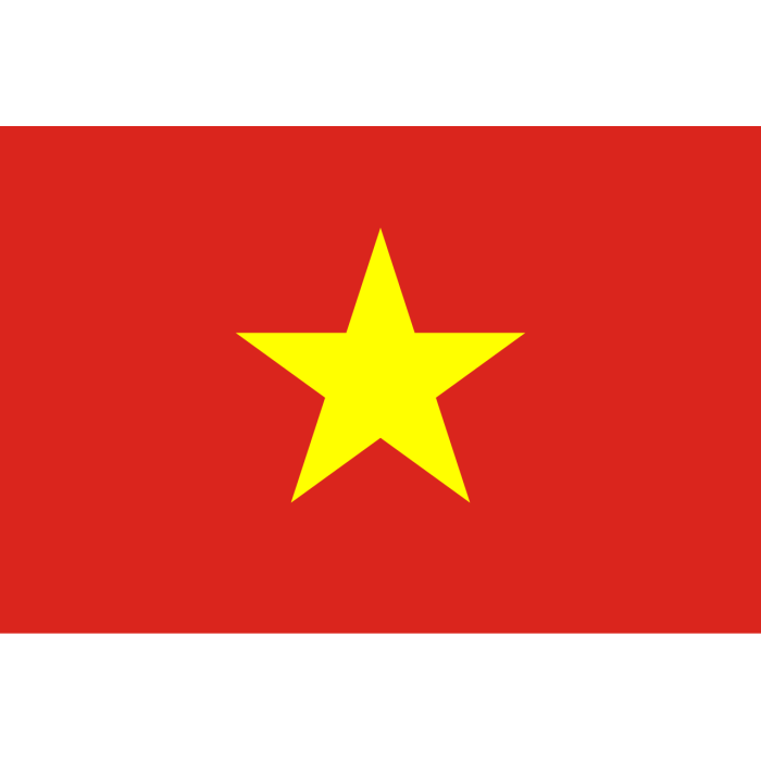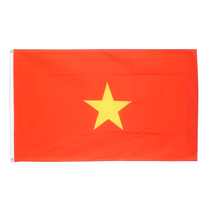 Для изготовления флага используется ткань с плотностью около 210 г/м². Этот материал обладает хорошими эксплуатационными характеристиками — он прочный, устойчивый к воздействию внешних факторов, таких как ветер, дождь и солнечные лучи. Полиэфирная ткань также легко окрашивается, что позволяет воспроизводить яркие и стойкие цвета флагов. Полиэфир является легким материалом, что облегчает поднятие флага и предотвращает его быстрое изнашивание, особенно в условиях сильного ветра. Флаг Вьетнама выполнен в насыщенном красном цвете, который символизирует революцию и кровь, пролитую за независимость. В центре размещена большая пятиконечная жёлтая звезда, представляющая единство рабочих, крестьян, интеллигенции, молодёжи и армии. Все цветовые элементы наносятся с высокой точностью и устойчивостью к выцветанию, что обеспечивает презентабельный внешний вид при длительном использовании. Данный флаг предназначен для использования при судозаходах в порты Вьетнама: Порт Кай Меп (Port of Cai Mep) Порт Хошимин (Port of Ho Chi Minh City) Порт Вунгтау (Port of Vung Tau) Он соответствует требованиям морской идентификации судов и обеспечивает узнаваемость флага при международных переходах и в портах прибытия.-
