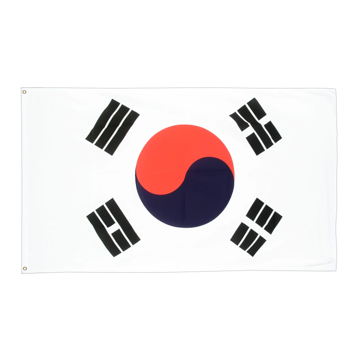 Флаг изготовлен из полиэфирной ткани с плотностью около 210 г/м². Этот материал отличается высокой прочностью и долговечностью, хорошо переносит дождь, ветер и солнечное излучение. Он легко окрашивается, что позволяет добиваться точной передачи цветов и обеспечивает устойчивость рисунка к выцветанию. Благодаря своей лёгкости ткань удобно использовать даже при сильных порывах ветра, что делает её идеальной для морских условий. Флаг Республики Корея (Тхэгыкки) выполнен с высокой точностью. На белом фоне, символизирующем чистоту и мир, размещён центральный круг — инь и ян — в красном и синем цветах, отражающий баланс противоположных сил. Вокруг него расположены четыре чёрные триграммы, каждая из которых представляет одно из природных начал: небо, землю, воду и огонь. Цвета флага — красный, синий, чёрный и белый — выполнены с высокой насыщенностью и стойкостью к атмосферным воздействиям. Флаг предназначен для использования при судозаходах в порты Южной Кореи: Порт Пусан (Port of Busan) Порт Кванъян (Port of Gwangyang) Он соответствует международным морским требованиям и является обязательным атрибутом при заходе судов в территориальные воды и порты Республики Корея.