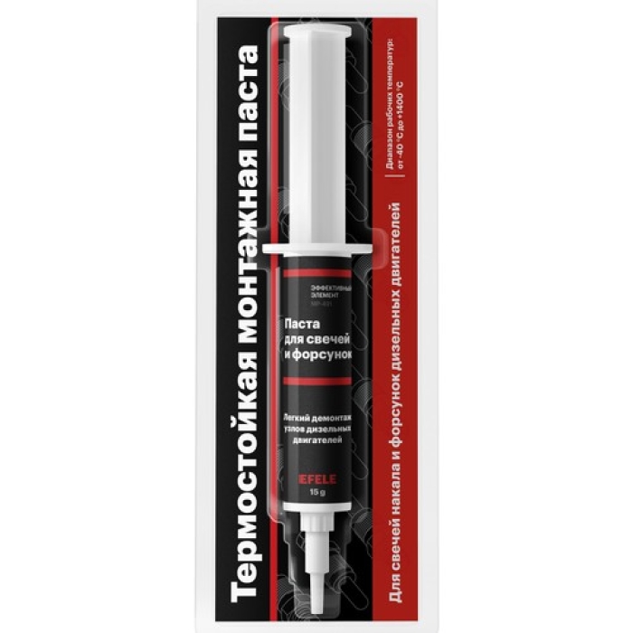 Паста для свечей накала Efele NLGI 1 – это надежное решение для защиты и облегчения монтажа различных деталей, работающих в условиях высоких температур и нагрузок. Она обеспечивает долговечность и надежность соединений, что делает ее идеальным выбором для профессионалов в области автомобильной и промышленной техники.