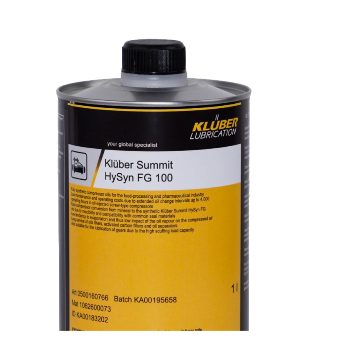 KLUBER Summit HySyn FG 100 — это синтетическое масло, специально разработанное для воздушных компрессоров, в том числе используемых в пищевой, фармацевтической и косметической промышленности. Продукт произведён на основе синтетических углеводородов и зарегистрирован по стандарту NSF H1, что делает его безопасным для применения в условиях возможного случайного контакта с продуктами и упаковкой. Кроме того, масло соответствует требованиям FDA 21 CFR §178.3570 и сертифицировано по стандарту ISO 21469.Подробнее