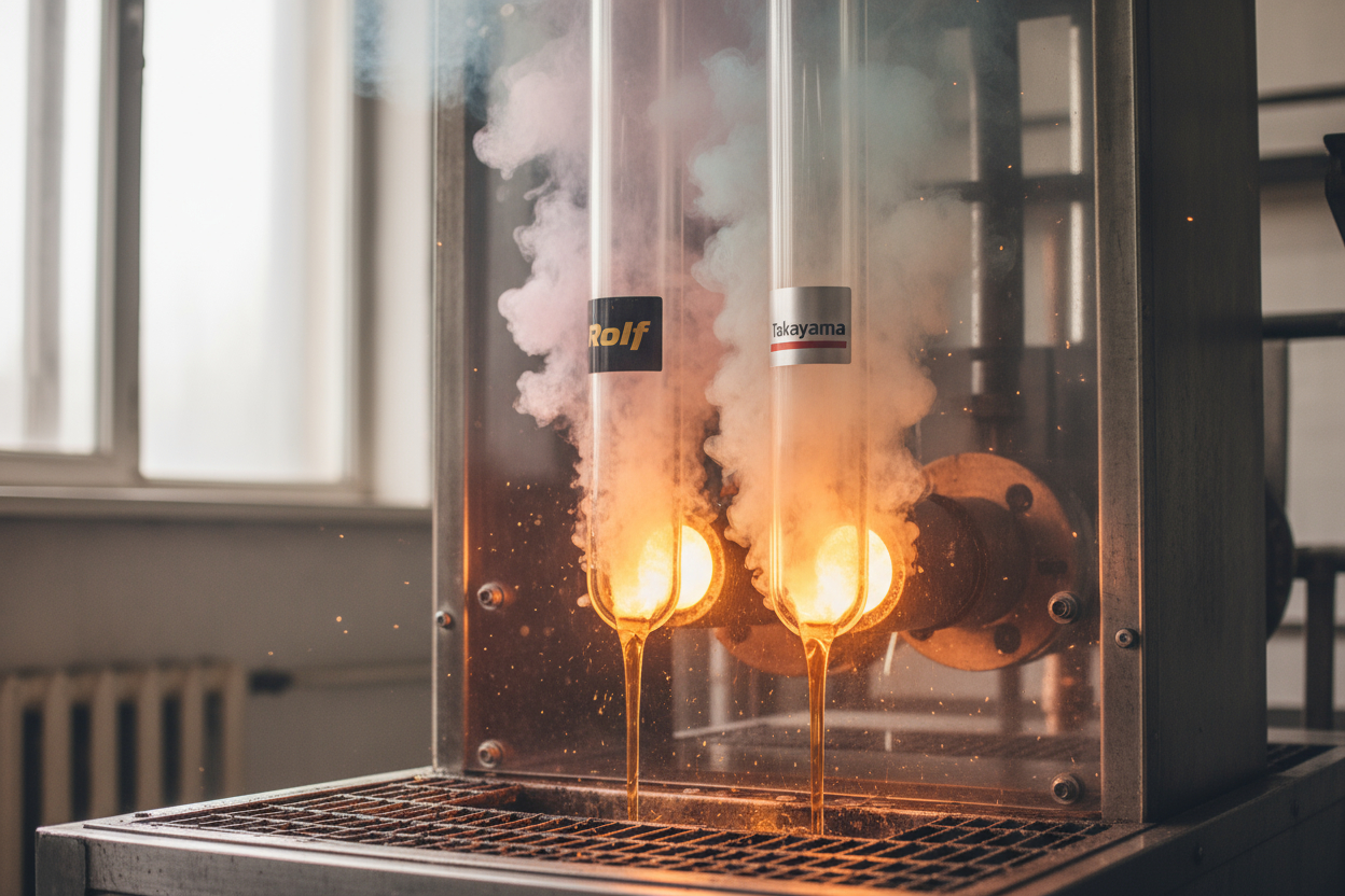Takayama показывает чуть лучшую чистоту из-за низкозольной формулы и щадящих присадок. Rolf лучше вымывает нагар — но это делает его темнее быстрее.