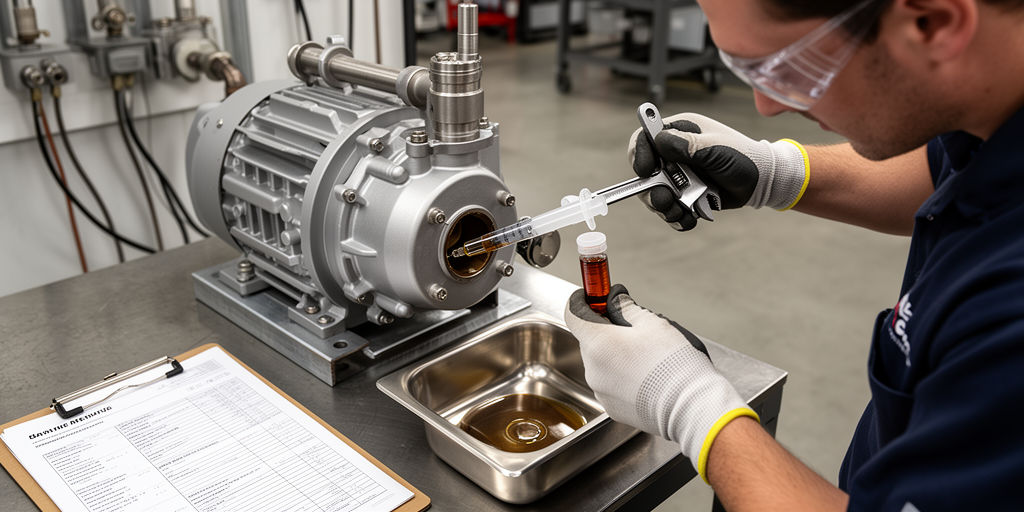 - Промывка: рекомендованные флюиды — совместимый PAO/растворитель с низкой испаряемостью; выполнить короткий прогон и слить промывочную жидкость.