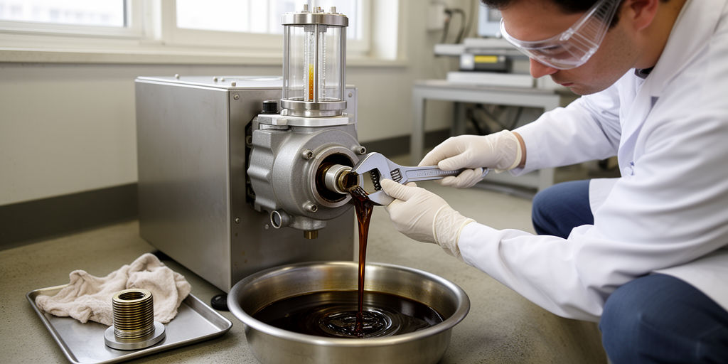 Проверьте уровень масла через смотровое окно: между отметками MIN и MAX. Остановите насос, дайте остыть 10–20 минут. Признаки замены: тёмный цвет, запах горелого/кислого, пена/эмульсия (конденсат), падение глубины вакуума. Рекомендуемая периодичность: 1000–2000 ч работы или 6 мес; при высокой влажности/агрессивных продуктах — чаще.